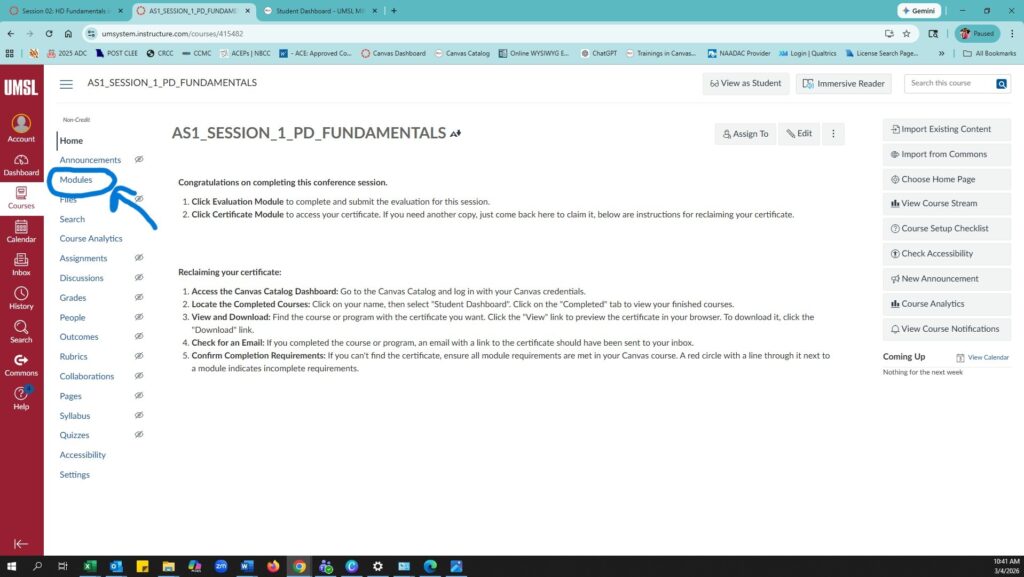 - After submitting the session evaluation, click on Modules to access the Certificate Module.