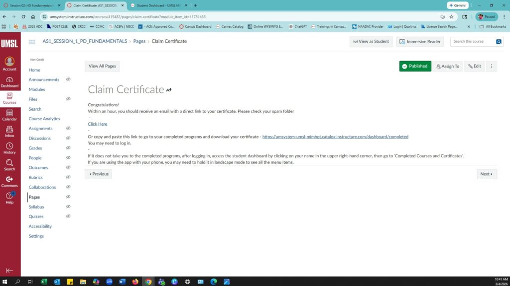You may return to Canvas at any time to access your certificates.